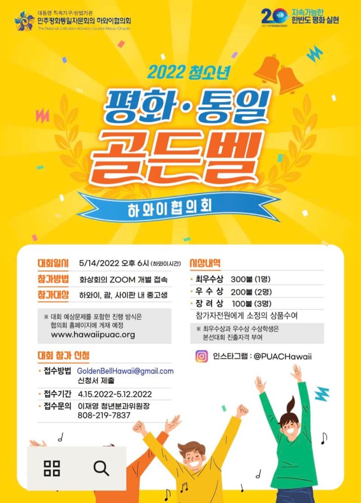 지난해에도 저희 평통의 골든벨 행사에 참여해주셔서 깊은 감사의 말씀을 드립니다.올해에도 민주평통은 재외동포 중·고등학생을 대상으로 한반도 평화와 통일에 대한 관심을 고양하고올바른 평화·통일관, 역사관 함양을 통한 글로벌 평화·통일인재를 육성하기 위하여 2022년 해외청소년 평화골든벨을 개최합니다.저희 하와이 지역 협의회에서는 2022년 5월 14일 오후 6시 (하와이시간) 에 평화 통일 골든벨행사를 개최합니다(예선대회). 참가대상은 하와이, 괌, 사이판 내 중고생이며, 대회 예상문제를 포함한 진행방식은 협의회 홈페이지에 게재되어있습니다. (민주평통 홈페이지 https://www.puac.go.kr/ntcnBbs/detail.do… 참조)올해에는 Zoom을 통해 대회가 진행될 예정이며, 자세한 사항은 추후 안내해드리도록 하겠습니다.예선대회 최우수상은 $300(1명), 우수상은 $200(2명), 장려상은 $100(3명) 이며 모든 참가자에게는 소정의 상품이 주어집니다.이번 하와이 지역협의회 예선에서는 약 2-3명이 선발됩니다. 선발되신 분들은 지역대회 본선 (5-6월경) 참여자격이 주어지며, 향후 이어지는 대회에서 우수한 성적을 거둘 경우 국내·해외 종합 결선대회에 (7~8월) 참여할 자격이 주어집니다(우승자 의장상).아울러 주변에 한반도 평화와 통일에 관심이 있는 현지 청소년들이 있으면 함께 참여하도록 널리 알려주시어 재미있는 추억도 쌓고 한반도에 평화에 대한 지식도 쌓을 수 있는 좋은 기회를 만드시기 바랍니다.2022 청소년 평화통일 골든벨 참가신청서는